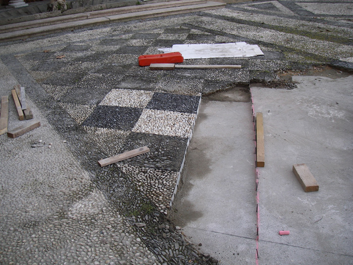 La pavimentazione, esposta agli agenti atmosferici, a causa del “disgregarsi” delle malte di allettamento che tenevano uniti i ciottoli, era stata soggetta ad un degrado molto spinto e alla perdita della continuità materica e formale della superficie a mosaico.