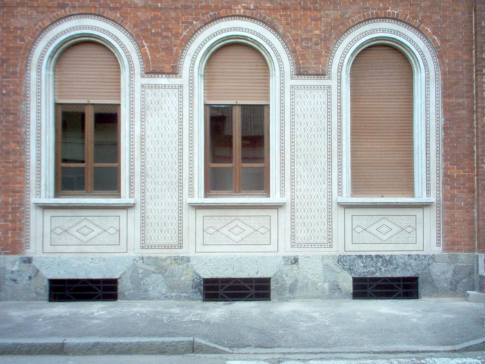 L’edificio eretto nel 1933 presenta le facciate costituite da murature con mattoni a vista alternate da porzioni d’intonaco a graffito. Lo stato di conservazione appariva, in particolare nelle zone più esposte agli agenti atmosferici, particolarmente critico. Dopo aver messo in sicurezza le parti più a rischio, si è proceduto alla pulitura, alla riadesione degli intonaci distaccati, alla stuccatura delle lacune con malta ed al rifacimento delle parti in graffito mancanti.